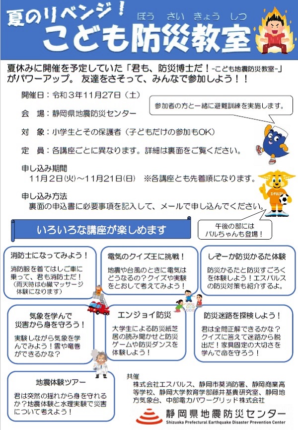 11/27(土)「静岡県地震防災センター こども防災教室」にパルちゃん参加のお知らせ