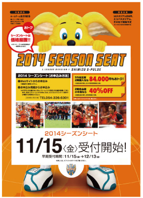 エスパルスは、2014シーズンの全ホームゲーム(20試合予定)を観戦できる『2014エスパルスシーズンシート』の申込受付を11月15日(金)より開始しますので、下記の通りお知らせいたします。