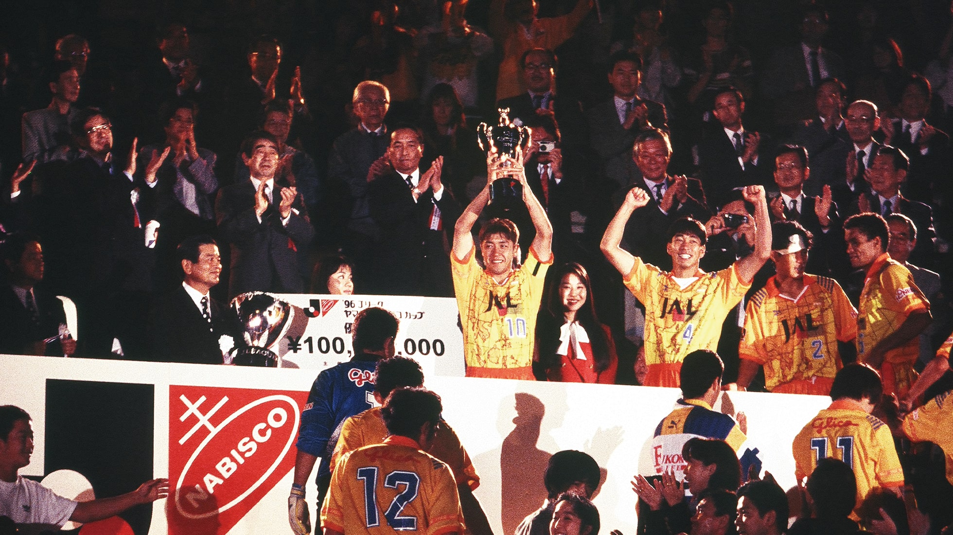 9月25日ナビスコカップ決勝、ヴェルディ川崎戦。終盤に2点のリードを追い付かれる苦しい展開の中、激闘が続いた延長戦、そして大会初となるPK戦へ。澤登正朗が決め、GK真田雅則が相手ふたり目のシュートを阻止する。サントス、大榎克己、森岡隆三、優勝への想いを込めるように次々とゴールネットを揺らすエスパルスの選手たち。そして迎えた5人目、オリバのシュートがネットに吸い込まれた瞬間、リーグ唯一の市民クラブとして産声を上げたチームに初の栄冠がもたらされた。表彰台で優勝カップを掲げる澤登の目には、5年分の想いが涙となって溢れていた。