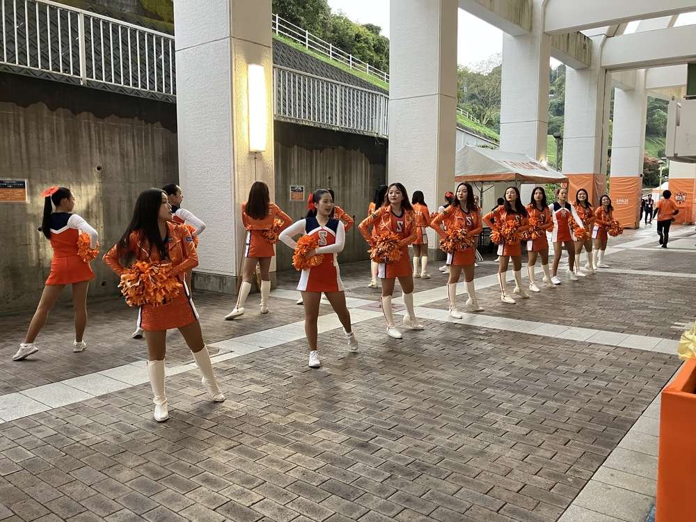 出演の時間になり、いよいよ始まります!オレンジウェーブと一緒に元気にピッチへ!