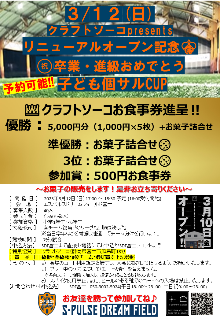 クラフトソーコpresents リニューアルオープン記念 卒業・進級おめでとう 子ども個サルCUP開催!!