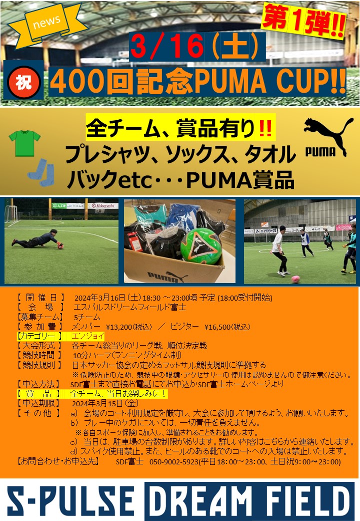 2024年3月16日、第1弾 第400回記念PUMACUP!!を開催いたします。