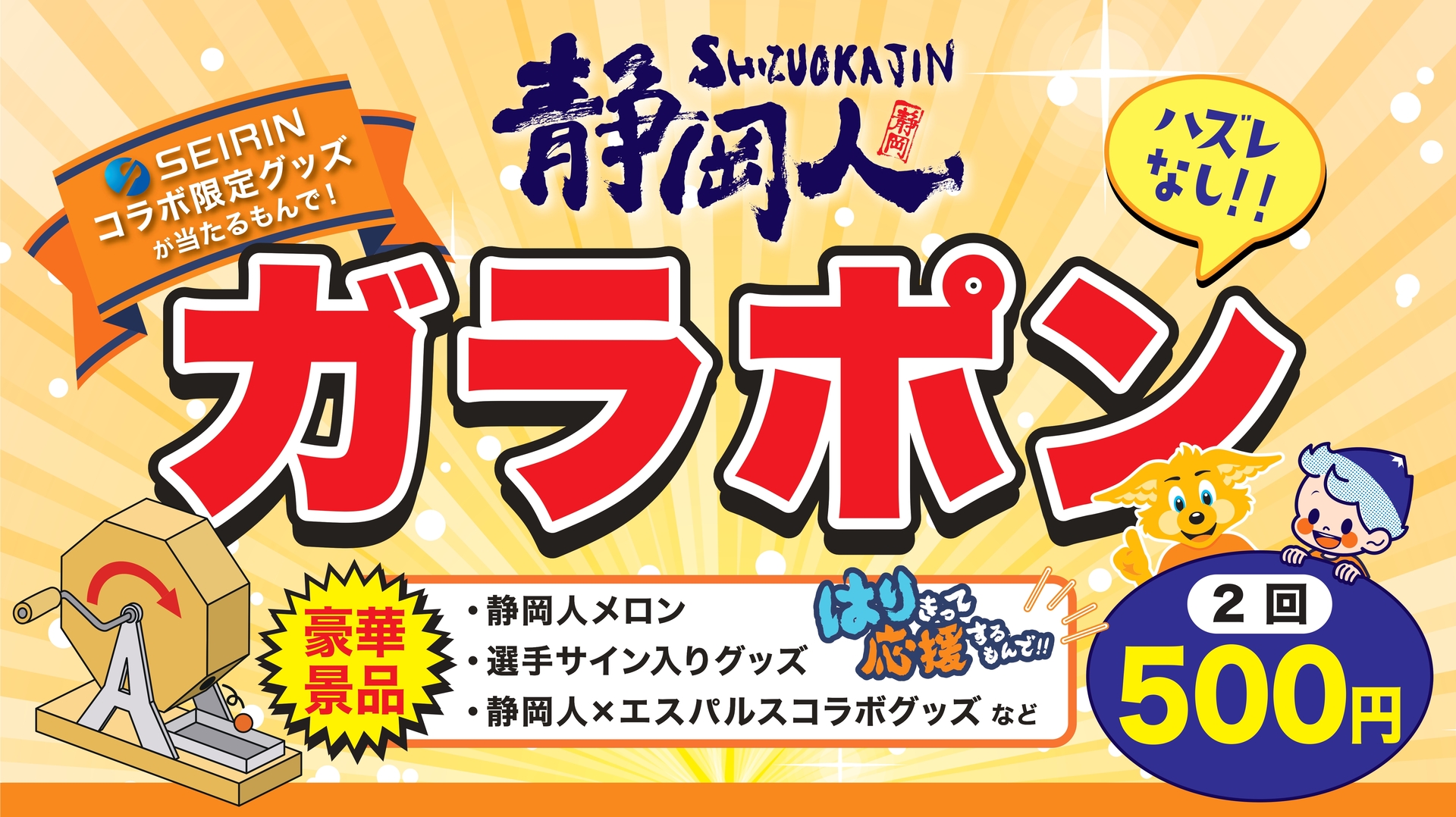 毎回大好評のガラポン抽選会では、お馴染み「山下メロン園」様のメロンや、選手サイン入りグッズの他、今回は「張り切る」に合わせて初登場となる新デザインの『静岡人×エスパルスコラボグッズ』などの景品をご用意しております。