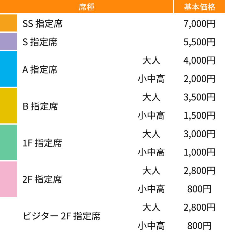 ※上記席種の販売価格は、ダイナミックプライシング(価格変動制)を適用いたします。発売初日から価格が変更となる場合もございます。