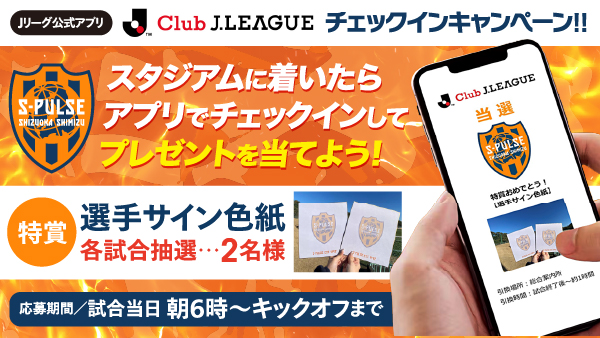 Jリーグ公式アプリ "Club J.LEAGUE"(クラブJリーグ)から、試合当日に観戦チェックインをすると、チェックインキャンペーンにご応募ができます!
