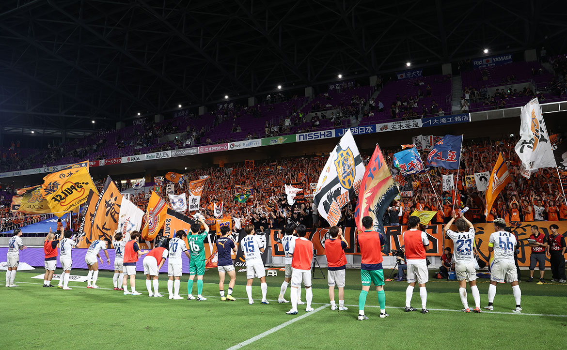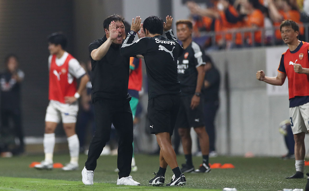 首位を走るサンガさんのホームに乗り込んで我々がどういうプレーを見せるのか、我々の価値をどう示すのかという話をしてきた中で、このアウェイの地まで約3,500人以上のサポーターファミリーが駆けつけてくれ、連勝する、京都さんにホームでの借りを返すという空気感をつくってくれ、選手たちはそれに応えてくれた。アップの時からしっかりとしたメンタリティと、やってやるんだというギラギラした目を持ちながらゲームに入った。そのため開始早々にPKが取れたという非常に狙い通りの入りができた中で、残念ながらPKは失敗したが気落ちすることなく、このアウェイの地で、このスタジアムの空気感の中でも堂々と最後の最後まで戦った。最後は押し込まれる時間もあったが、そこを全員で粘り強く、交代選手含めて、そしてピッチに立てなかった選手も最後の最後まで声を出してピッチにいる選手たちに声援を送っていた。この一体感、粘り強さをもってまた2日後、浦和戦が来るので最大限のリカバリーをしてホームで浦和相手にアウェイの借りを返せるように全員でやっていきたい。選手たちが本当に素晴らしい野心と己の存在価値、アイデンティティを示した素晴らしいゲームだったと思う。