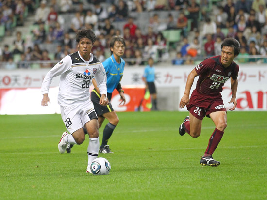 ヴィッセル、中央でボールを奪ってカウンター。右サイドを朴康造が走りクロスを上げようとしたが、ここは太田宏介がきっちりカバーしており思うように上げさせない。