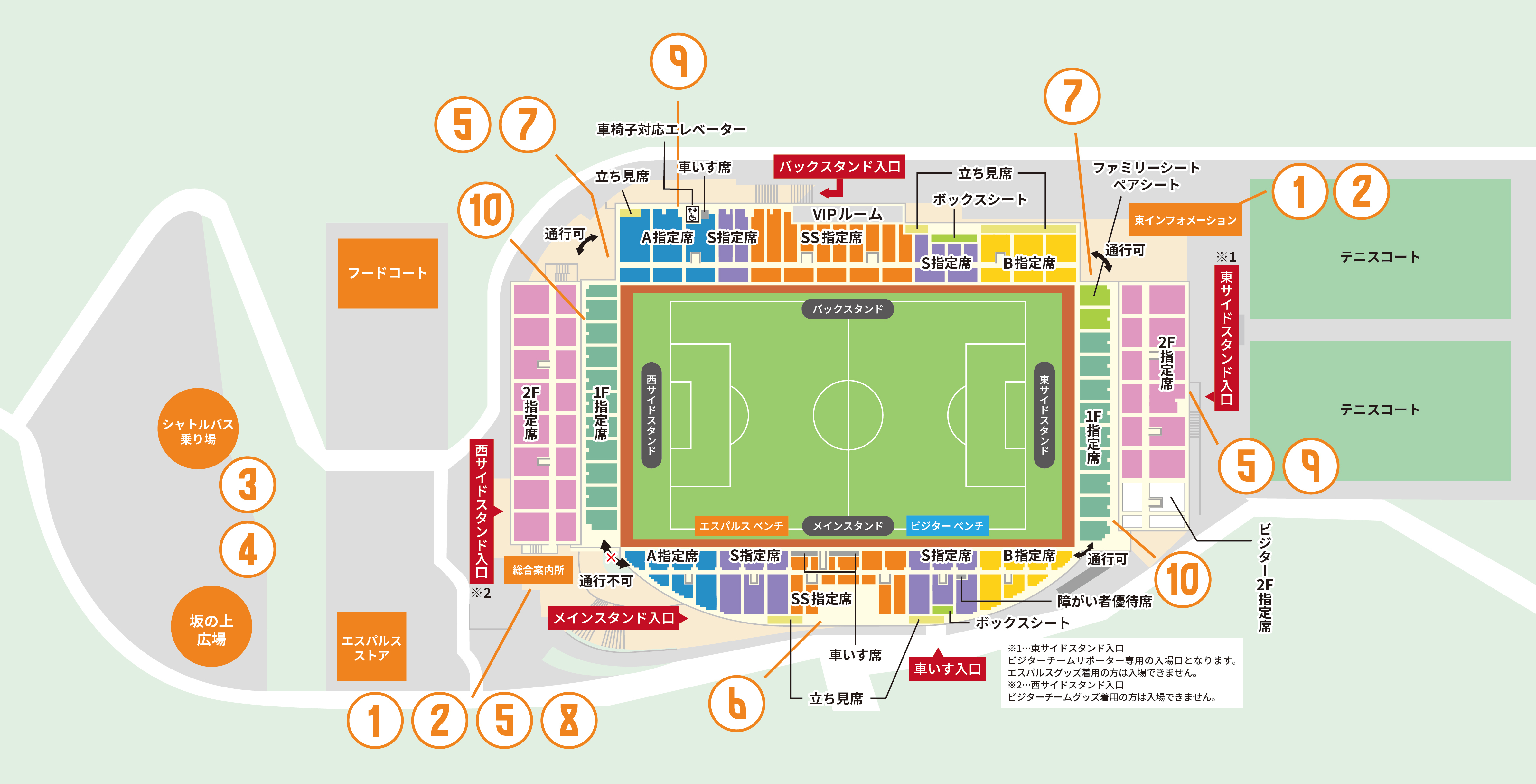 ベビーカー置場での破損、紛失、盗難などの責任は一切負うことはできませんので、あらかじめご了承ください。■場所:総合案内所 / 西サイドスタンドとバックスタンドの間 / 東サイドスタンド入場ゲート前