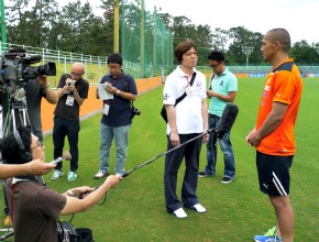 練習後、グラウンドで行なわれたセレモニーでは、足立さんが小野選手に「チカラを一つに、頑張ってください!」とユニフォームを手渡しました。その後行なわれたインタビューで小野選手は、「派手なプレーもいいが今回は、一生懸命なプレー、頑張る姿でメッセージを送りたい」と答えました。