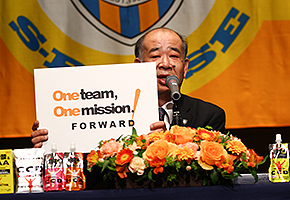 まず壇上にあがった竹内康人社長から、2013クラブスローガン“One team , One mission . FORWARD!”が発表されました。昨シーズンのスローガン“One team, One mission.”に、前進を意味する「FORWARD!」が付け加えられた新スローガン。決定の理由について竹内社長は、
