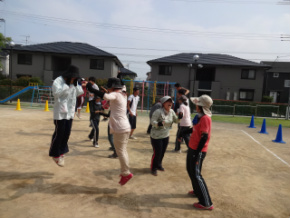 はじめに講義で子どもの発育・発達を考えた運動の大切さを学んでいただき、その後園庭で実技を行いました。