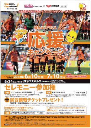 浦和レッズ戦(8/24@エコパ)のマッチデースポンサーである日清食品と静岡県内を中心に展開するスーパーマーケットのマックスバリュ東海の共同企画による『清水エスパルス応援キャンペーン』を6月10日(月)より実施いたしますので、下記の通りお知らせいたします。