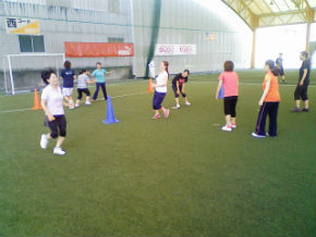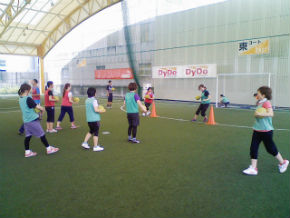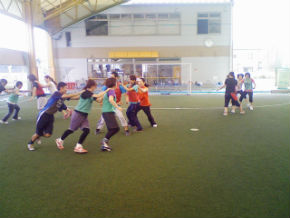 まずグラウンドで実技を行ううえで、先生たちの緊張をほぐすために「アイスブレイク」という仲間同士が打ち解けあうメニューを行い、その後に「動きづくり系」「鬼ごっこ系」「ボールフィーリング系」「ゲーム系」と四つに分類されたメニューを紹介し、先生からは「久しぶりに童心に帰って園児になった気分で楽しめました。園に帰って子供達とやってみたい。」という感想をいただきました。