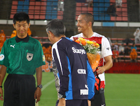 アフシン ゴトビ監督から小野伸二選手に花束の贈呈 ©︎︎︎S-PULSE