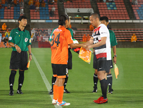 高木純平選手と小野伸二選手。ゲームキャプテン同士のペナント交換。 ©︎︎︎S-PULSE