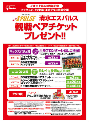 エスパルスオフィシャルクラブスポンサーの江崎グリコによる『清水エスパルス観戦ペアチケットプレゼント!!』をマックスバリュ東海にて実施いたしますので、下記の通りお知らせいたします。