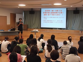 今回の講習会は、5月の講習会に引き続き第2回目の開催となり、園務多忙の中約50名の先生方にご参加いただき、「子どもの体と運動あそび」をテーマに講義と運動あそびの実技を行いました。