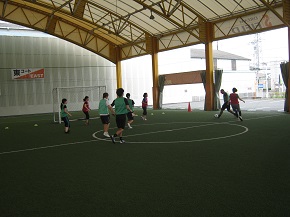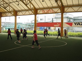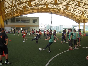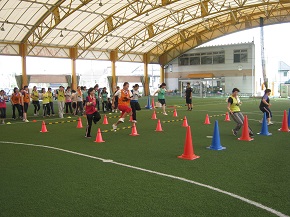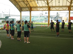 まず最初はグラウンドで実技を実施。先生方との距離感や雰囲気を和らげるために「アイスブレイク」という仲間同士が打ち解けあうメニューを行いました。その後、「鬼ごっこ系」「動きづくり系」「ボールフィーリング系」「ゲーム系」と四つに分類されたメニューを紹介・実践させていただきました。