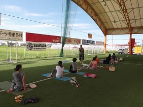 人工芝のピッチで太陽の光を浴びながらヨガを楽しみます。本来“ヨガ”という言葉には結ぶ、つなげると言った意味があります。毎日が忙しくて心と体が離ればなれ、疲れたりストレスを最近感じている方、本来の自分をとり戻して見ませんか?体の硬い方、頭の硬い方、ヨガは初めての方もお待ちしています