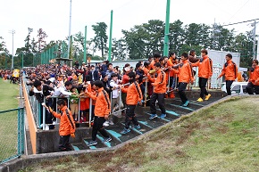 選手たちがグラウンドへ姿を見せると、駆けつけたサポーターの皆さんからは温かい拍手が起こり、迎え入れていただきました。