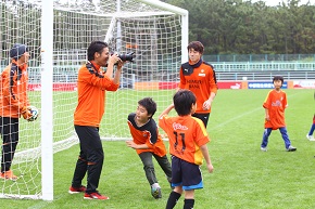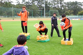 グラウンドでは、選手と一緒になってサッカーを楽しむことができるアトラクションを行いました。選手との会話やプロのプレーを目の前にして自然と笑顔に包まれている様子でした。