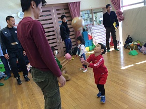 これはエスパルスのホームタウンで誕生した子どもたちが、夢を持ち元気に育ってほしいという願いを込めた子育て支援事業で、今回は3~5歳児を持つ親子を対象に行われました。