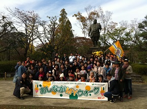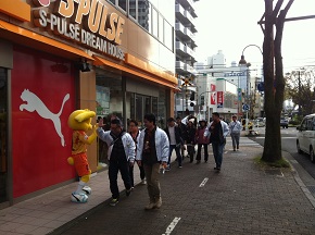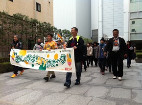 このイベントは、東日本大震災で親を亡くした子どもたちを支援するイベントで、主催の明治安田生命静岡支社のほか、この企画に賛同した東京海上日動火災保険とエスパルスの社員・家族ら約160名が参加しました。参加者は、午前10時に明治安田生命静岡支社があるJR静岡駅南口付近を出発し、エスパルスドリームハウス静岡葵や静岡浅間神社などを経由して、駿府城公園をゴールとする約5キロのコースを歩きました。