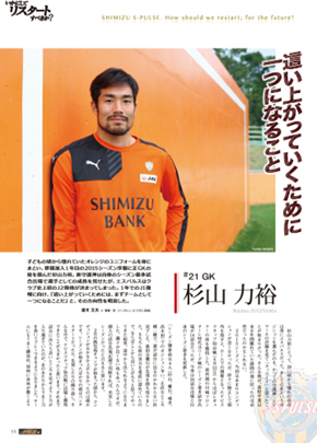 「子どもの頃から憧れていたオレンジのユニフォームを身にまとい、移籍加入1年目の2015シーズン序盤に正GKの座を掴んだ杉山力裕。新守護神は自身のシーズン最多試合出場で選手としての成長を見せたが、エスパルスはクラブ史上初のJ2降格が決まってしまった。1年でのJ1復帰に向け、『這い上がっていくためには、まずチームとして一つになることだ』と、その方向性を明言した。」