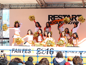 屋外の海側デッキ特設ステージでは12時からJam9ライブがスタートし、サポーターの熱が徐々に高まります。続いて、オレンジウェーブショー。ダンスの他、今年からオレンジウェーブに加わる新メンバーの紹介が行われました。