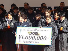 その後、株式会社アルバイトタイムス 垣内康晴 代表取締役社長より、エスパルス年間ベストプレーヤー「グッドJOB賞」として大前元紀選手に賞金の100万円が贈呈されました。