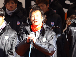 今日のファン感謝デー、これだけ寒い中、多くの方々に来ていただきまして、『あること』を成し遂げようという気持ちがひしひしと伝わって参ります。昨年10月24日以来、フロントとして現場として、できる準備は全てやって参りました。細かいことは申し上げませんが、ここにいるメンバーがそれを物語っております。そして、新監督として小林伸二監督を招き、新コーチングスタッフのもと、1月12日からチームは始動しております。「これがエスパルスのサッカーだ!」去年はそれがなかった。それを定め、新監督のもと12日から例年になく選手がクタクタになるまで練習をし、今日を迎えております。準備は準備として、開幕までまだ時間はありますが、今日ここで一つ、皆さんとともに共有しておきたいことがあります。先ほどもお祈りをしてきましたが、私たちには二択はありません。戻るか、戻らないかではありません。元居た場所に戻る。これを一念に、このシーズンを戦って参る所存でございます。今年一年、遠いところもあります。応援し辛い場所もあります。ただ、この一年がエスパルスにとってもう一度生まれ変わって、リスタートして、元居た場所で往年の強さを発揮するため、一年の努力の道程となると考えて、皆さんと一緒に戦って参りたいと思います』