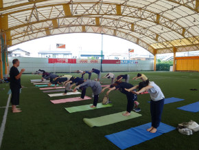 人工芝のピッチで太陽の光を浴びながらヨガを楽しみます。本来“ヨガ”という言葉には結ぶ、つなげると言った意味があります。毎日が忙しくて疲れたりストレスを感じている方、本来の自分を取り戻してみませんか?体の硬い方、頭の硬い方、ヨガは初めてという方もお待ちしています。