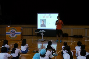 今回は5年生の児童44名を対象に、「人の体のつくりと運動」を学習する理科の授業を実施しました。生徒からの拍手で迎えられた碓井選手。自己紹介の後には「プロの技」として遠投を披露。体育館の端から端まで投げられた、強くて速いボールに子供たちもビックリです。