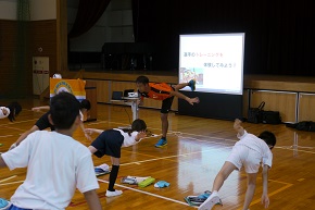 授業に入り、まずは碓井選手が通常のシュートを児童の目の前で披露。次に、膝を固定した状態でのシュートを披露しました。スーパースロー映像を確認しながら、器具をつけた状態でシュートの威力が落ちた理由と、関節や筋肉との関係性や働きについて考えました。また、碓井選手指導の下、体幹の筋肉を鍛えるハードなトレーニングも体験。児童たちは、「苦しい!」と声を上げながらも懸命に取り組んでいました。