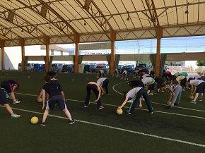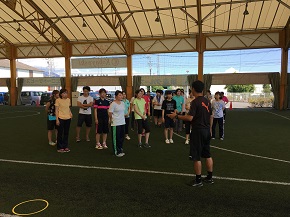 非常に暑い中、園務多忙な合間をぬって富士市は「20名」、富士宮市は「11名」計31名の熱心な先生方に参加していただきました。まずグラウンドで実技を行ううえで、先生方の緊張をほぐすために「アイスブレイク」という仲間同士が打ち解けあうメニューを行い、その後に「鬼ごっこ系」「動きづくり系」「ボールフィーリング系」「ゲーム系」と四つに分類されたメニューを紹介・実践させていただきました。実技の後には講義を行い、実技の振り返りと質疑応答などの時間を設け、多くの先生方から普段の園での子ども達の様子などの意見をいただくことができ、有意義なディスカッションとなりました。