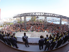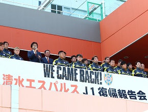 本日、2016年11月26日(土) エスパルスドリームプラザにて、J1復帰報告会を実施しました。会場に訪れた約4,000人のファン・サポーターの皆さまからの大きな拍手と共に、選手全員と左伴繁雄社長、小林伸二監督およびコーチングスタッフがエスパルスドリームプラザ2階テラスに登場しました。