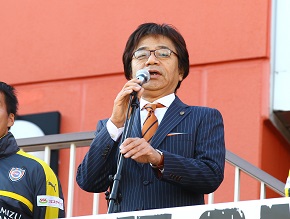 「ホーム、アウェイ共に想像を遥かに超える応援をいただきながら、昨シーズン苦い思いをした選手たちが頑張り、元いた場所、J1に復帰することができました。改めてお礼を申し上げます。」と挨拶し、さらに「来シーズンJ1でのホーム開幕戦で勝ちロコをしましょう!」と来季への意気込みを語りました。