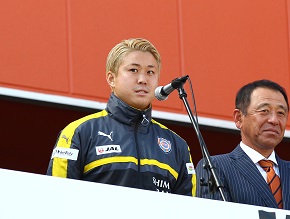 「今シーズンの熱い応援、ありがとうございました。J1に戻り良かったと思っていますが、これからジャンプをしなければいけません。そのための1年だったと思えるよう、J1で活躍し、皆さんに喜んでもらえるようなチームを作っていきたいと思います。来季も熱い応援、よろしくお願いします。」と1年間のご声援に対して、お礼の言葉を述べるとともに、来シーズンへ向けての意気込みを語りました。