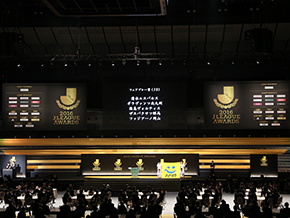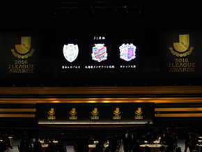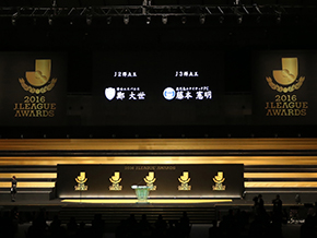 白崎凌兵選手が明治安田生命J2リーグベストゴール賞、鄭大世選手がJ2得点王を受賞。大前元紀キャプテンとともにJ1復帰への大きな活躍を見せた両選手に賞賛の拍手が送られました。