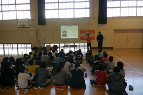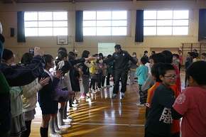 授業の最後は質問コーナーです。「GKにとって一番大切なことはなんですか?」という児童の問いに、羽田コーチは「チームを絶対に助けるんだという強い責任感だと思います」と答え、自身の現役時代を振り返りながら、また、今だからこそ伝えられるメッセージを送りました。最後にエスパルスドリーム教室オリジナルクリアファイルを贈呈し、授業は終了しました。