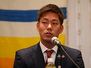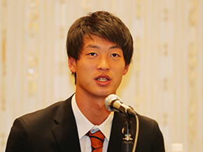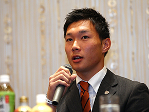 『こんにちは。専修大学より加入した飯田貴敬です。夢であったプロ生活をこの伝統あるチームでスタートできるのは本当に幸せに感じますし、このチームで自分の力を最大限に発揮し、チームの勝利に貢献できるように頑張っていきたいと思いますので、応援よろしくお願いします。』