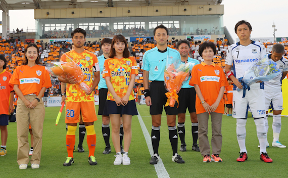 ファミリーマートおよび佐藤美希Jリーグ女子マネージャーより主審・両チームキャプテンへ花束贈呈 ©︎︎︎S-PULSE