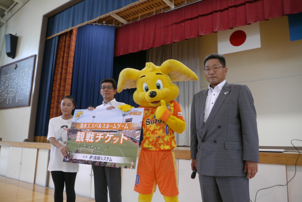 クラブを代表して贈呈式には、株式会社エスパルス・片岡裕喜常務取締役とオフィシャルマスコットのパルちゃんが出席しました。片岡常務の「We are ~! SHIMI~ZU S-PULSE!」という大きな掛け声のあとに挨拶すると、児童一同が大きく元気な声でご挨拶してくれました。片岡常務が今回の招待企画の経緯・主旨を説明し、ご都合により当日ご欠席となった小林社長のコメントを代読しました。