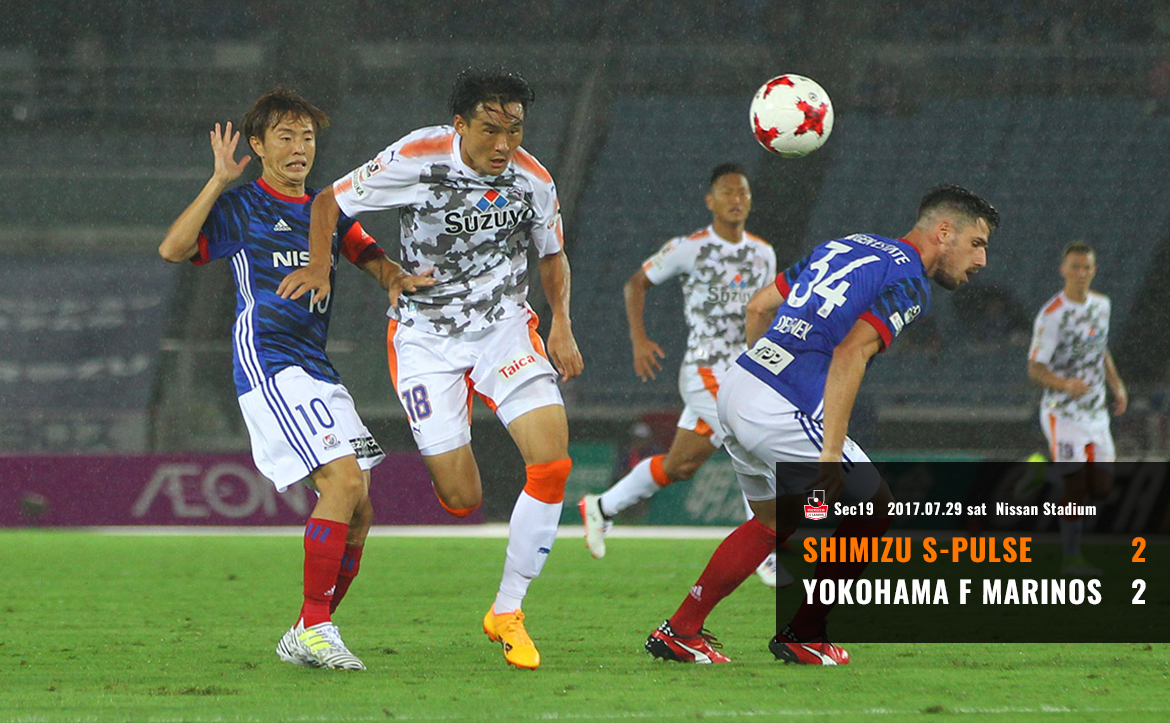 The weather took centre stage in the build up to Saturday’s game at Yokohama F. Marinos, a torrential and sustained downpour catching many fans unaware. Three hours before kick off, dark clouds rolled over Kanagawa prefecture, the prolonged precipitation lasting well into the night. Undoubtedly, the conditions impacted on the game, the result being a fast paced, open contest, with no shortage of goal mouth action and excitement.