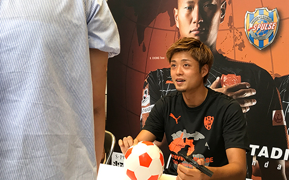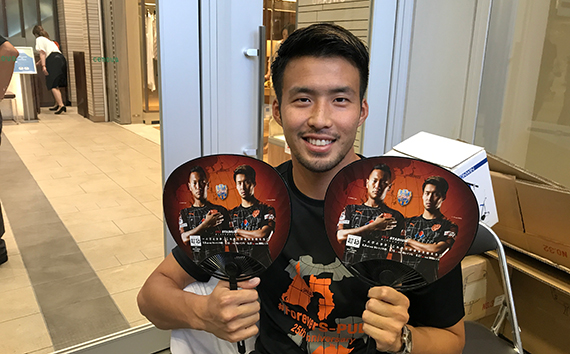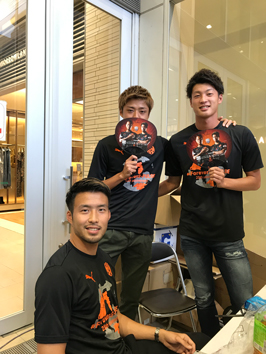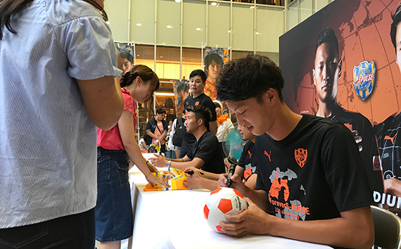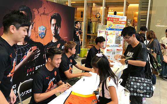『S—PULSE超ドSシリーズ』プロモーションうちわ・エスパルスオリジナル風船配布に始まり、パルちゃん写真撮影会、新静岡セノバ3Fフードコートグリーティング、オレンジウエーブ、オレンジウエーブガールズショー、選手サイン会等多彩なイベント内容で、開場は盛り上がりました。選手サイン会では、犬飼智也選手、松原后選手、立田悠悟選手の3名に参加しました。一人一人丁寧にサインをし、時折、会話も交え、終始和やかな雰囲気の中、多くの方々に感謝しながら、対応していました。