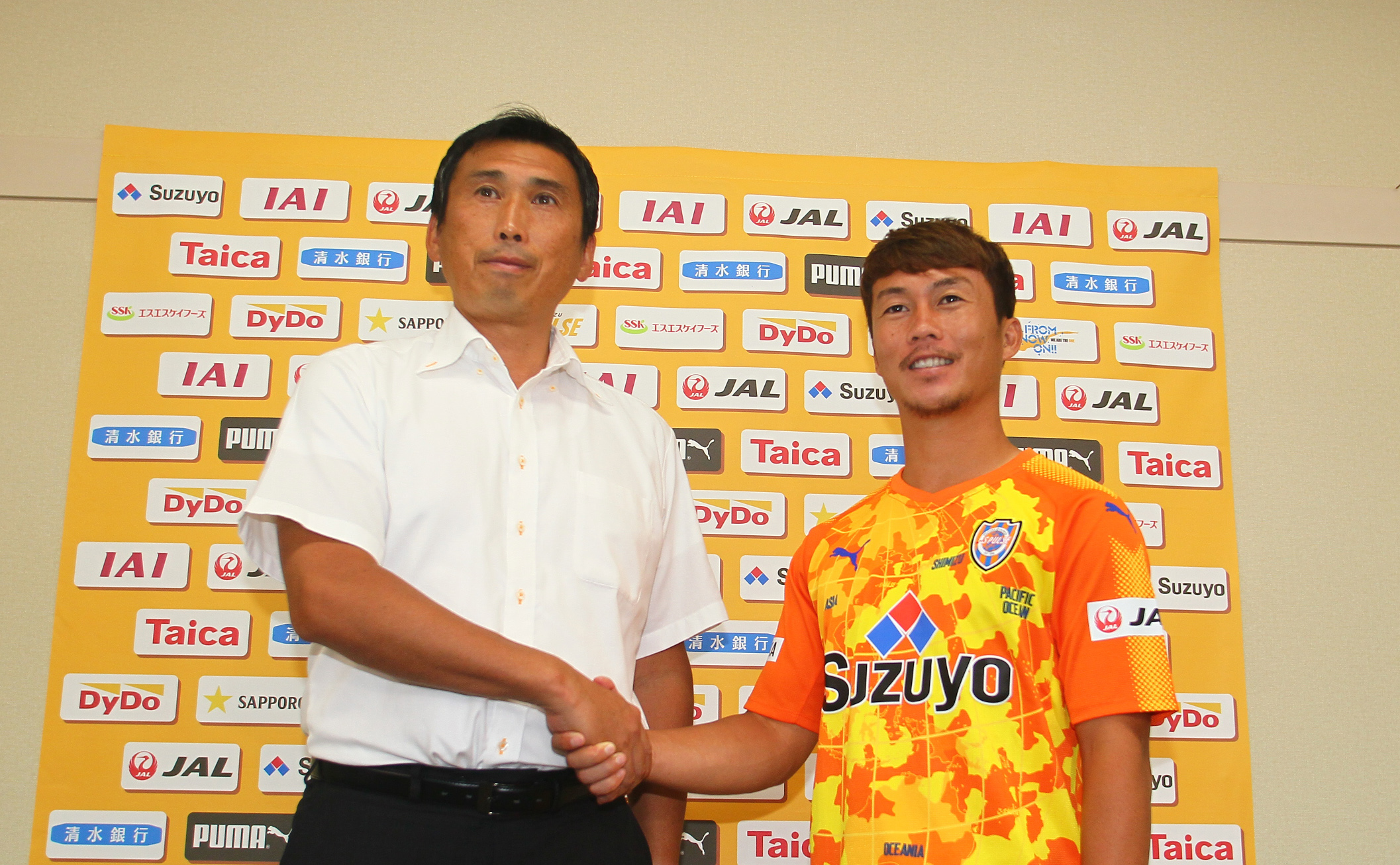 内藤直樹強化部長と握手をする清水航平選手 ©︎︎︎S-PULSE