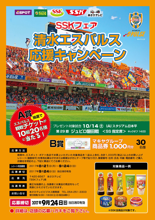 エスパルスオフィシャルクラブサプライヤーのエスエスケイフーズと同クラブスポンサーのマキヤグループ(エスポット・ポテト)による『SSKフェア 清水エスパルス応援キャンペーン』(8月21日~)が実施されますので、下記の通りお知らせいたします。