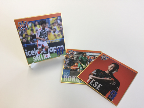 ミニ色紙に、アウェイでのプレー写真をプリント!飾るためのスタンドも封入しています。シルバーの見えない袋に封入!