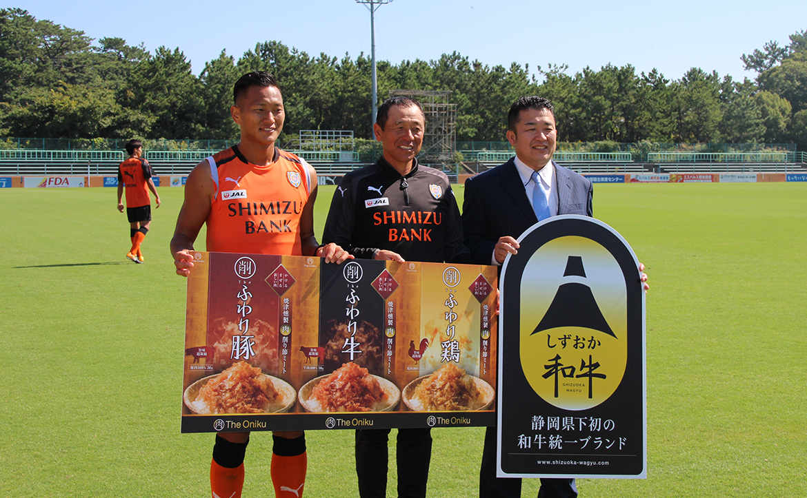 また、今以上にエスパルスを応援し、静岡を盛り上げたいという同社の想いから先の贈呈品に加え、今季終了までの全試合において、得点をした選手には毎回「しずおか和牛1キロ」を、さらに10月14日(土)開催のジュビロ磐田戦に勝利した際には、全選手・監督スタッフに「しずおか和牛1キロ」を贈呈いただくこととなりました。