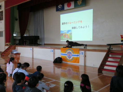 まずは、市川コーチが児童の目の前でシュートを披露。力強くて速いシュートに児童からは驚きの声が上がりました。シュートする時の体の動きをスロー映像で観察しながら、関節や筋肉のはたらきについて考えました。また、プロ選手が日頃行っている、体幹の筋肉を鍛えるトレーニングも体験。児童たちは、「つらい!」と声を上げながらも懸命に取り組んでいました。